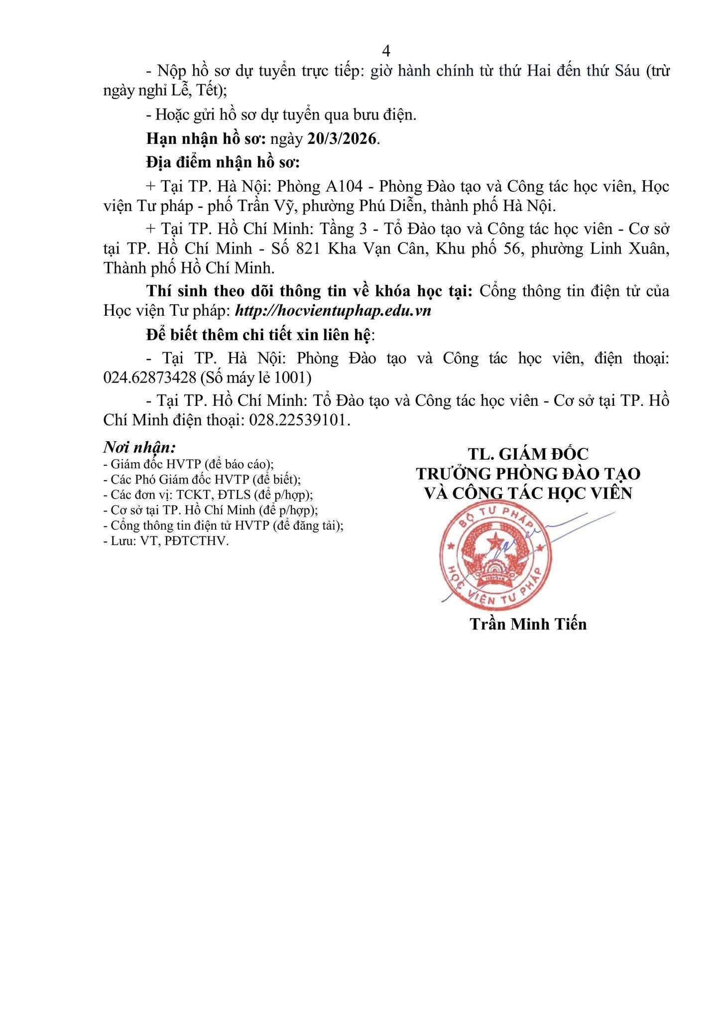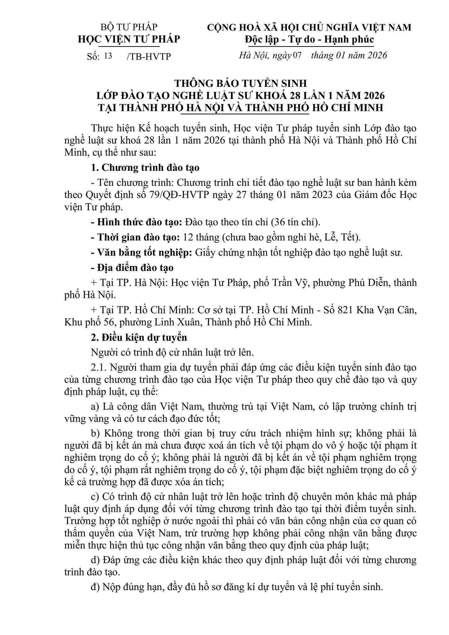 Thông báo tuyển sinh lớp đào tạo nghề luật sư khóa 28 lần 1 năm 2026 Cập nhập: 9/1/2026 | 4:41:00 PM - CÔNG TY LUẬT DRAGON Tải về: Thông báo tuyển sinh lớp đào tạo nghề luật sư khóa 28 lần 1 năm 2026 Học viện Tư pháp đã chính thức công bố Thông báo tuyển sinh Lớp đào tạo nghề Luật sư – Khóa 28 (Lần 1 năm 2026) tại Hà Nội và TP. Hồ Chí Minh. Tác giả: Luật sư Bùi Thị Mai Có thể bạn quan tâm Công văn số 01/TAND-PC ngày 05/01/2026 hướng dẫn áp dụng Bộ luật Hình sự Luật Phá sản 2014 (Số 51/2014/QH13) Luật đất đai 1987 (3-LCT/HĐNN8) Nghị định 16/2023/NĐ-CP tổ chức quản lý doanh nghiệp trực tiếp phục vụ quốc phòng an ninh Luật Doanh nghiệp 2020 (Số 59/2020/QH14) Thông tư 14/2023/TT-BTNMT Sửa đổi Thông tư nộp xuất trình sổ hộ khẩu lĩnh vực đất đai Nghị định 35/2017/NĐ-CP Thu tiền sử dụng đất thu tiền thuê đất thuê mặt nước khu kinh tế công nghệ cao Nghị định 47/2014/NĐ-CP Bồi thường hỗ trợ tái đinh cư khi nhà nước thu hồi đất Nghị định 35/2015/NĐ-CP về quản lý sử dụng đất trồng lúa Nghị định 01/2017/NĐ-CP Sửa đổi nghị định hướng dẫn Luật Đất Đai mới nhất