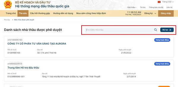 Bước 5: Xem kết quả tra cứu hiển thị trên màn hình. Bạn có thể xem chi tiết thông tin của từng nhà thầu bằng cách nhấn vào tên nhà thầu.